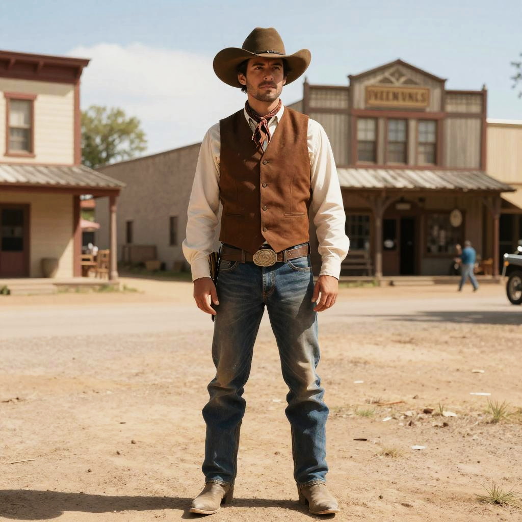Portrait of a man dressed as a cowboy in a brown vest, beige shirt, blue jeans, and a wide-brimmed brown hat standing in the dusty street of a historical Wild West town. The background features old wooden buildings including a saloon and general store, with clear sky and a vintage atmosphere.