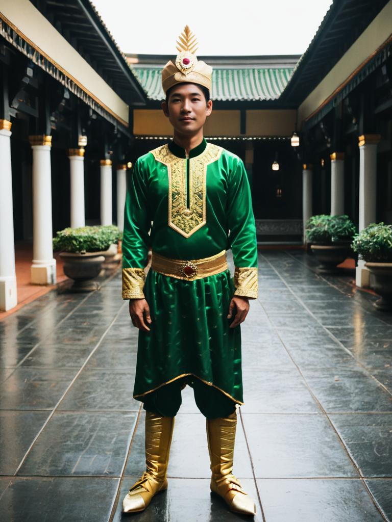 Singkil Costume Man, man in a green and gold costume standing in a courtyard --sref 1390
