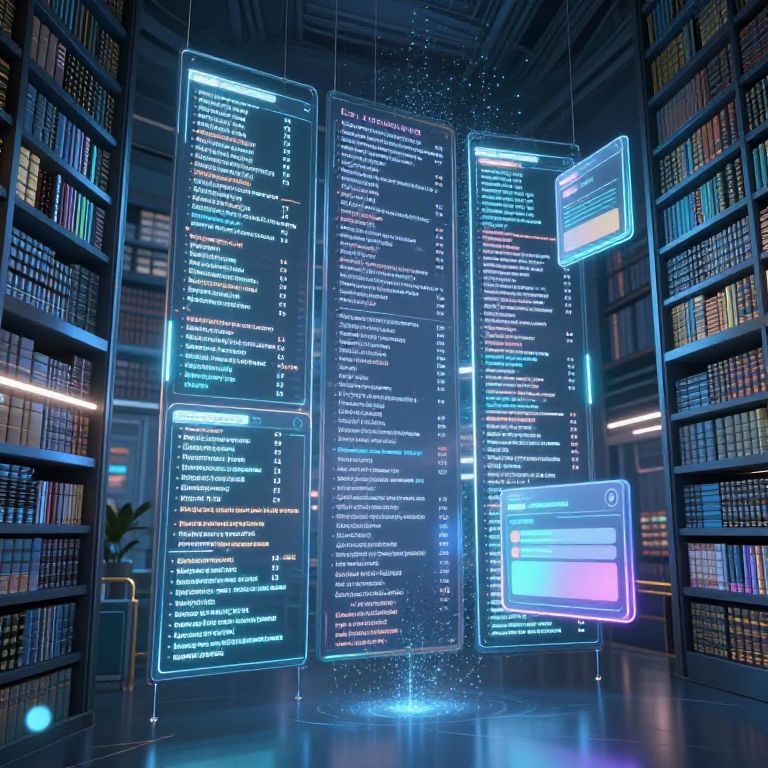 A CGI image of a futuristic library with tall, illuminated, neon-blue holographic screens displaying dense code lines hanging in the center. The screens are surrounded by dark wooden bookshelves filled with books, creating a stark contrast. The floor reflects the holographic glow, and small particles of light float around the screens. The background features a dimly lit, industrial-style ceiling with exposed pipes. The holographic screens are suspended by thin, nearly invisible wires, adding to the sci-fi atmosphere. The overall color scheme is dominated by blue and black, with a touch of purple from a smaller holographic screen to the right.