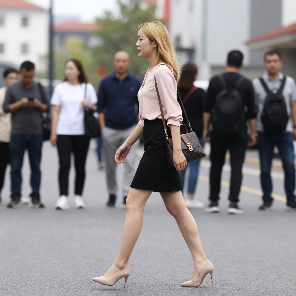 Blonde woman in pink blouse and black skirt, beige heels, brown patterned handbag, crossing busy street. Background: blurred pedestrians, buildings, streetlights. Daytime, overcast. Several people in casual clothes, some standing, some walking.