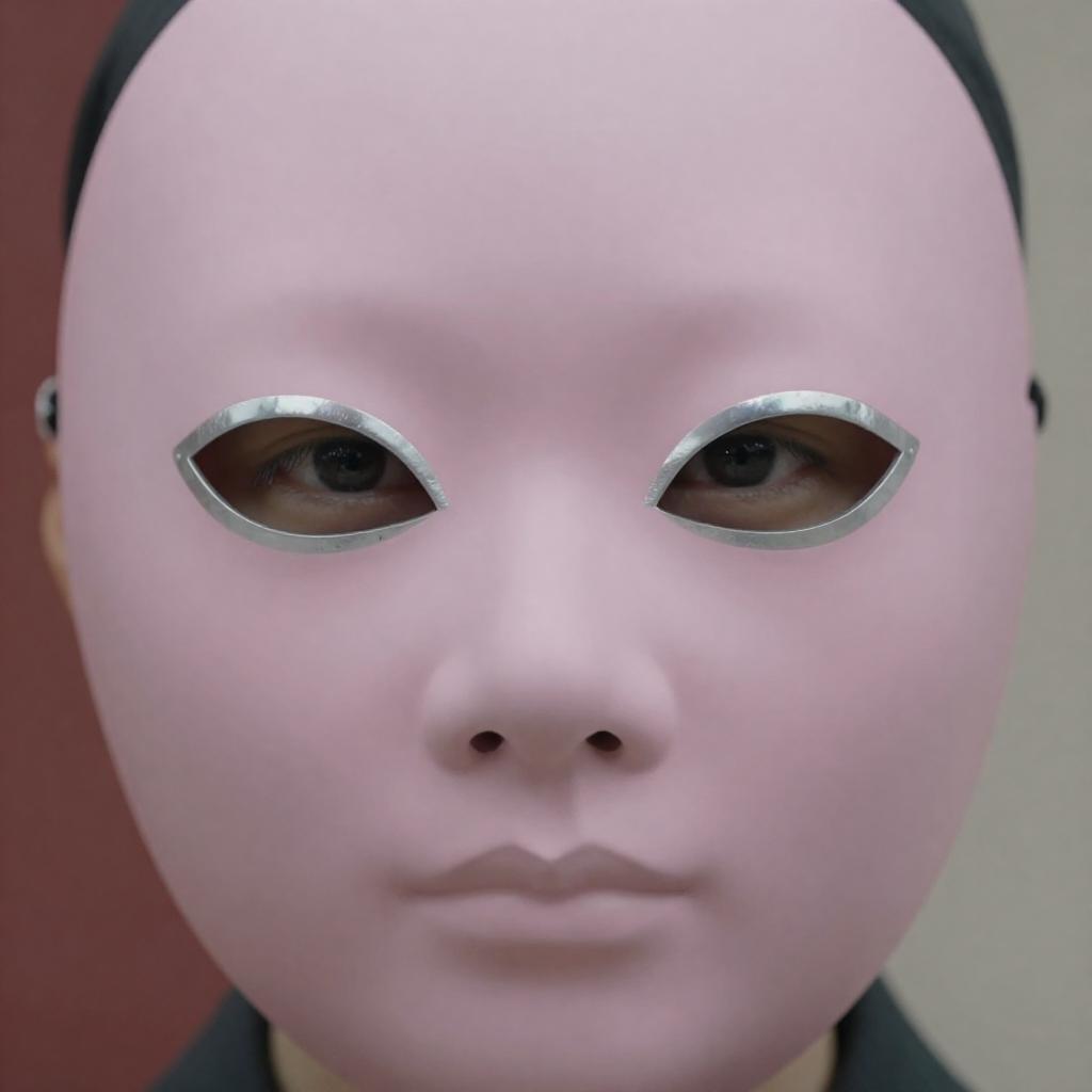 Close-up photograph of a person with pink-tinted skin wearing a mask with large, reflective, silver eyes. The mask covers the entire face, leaving only the eyes and a small portion of the nose visible. The background is blurred, with hints of a red and beige environment. The person's expression is not visible.