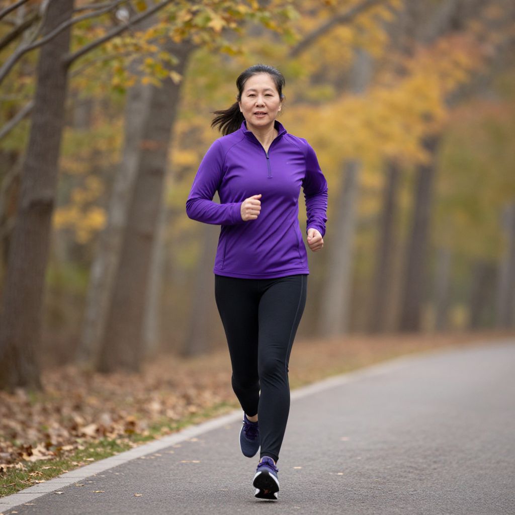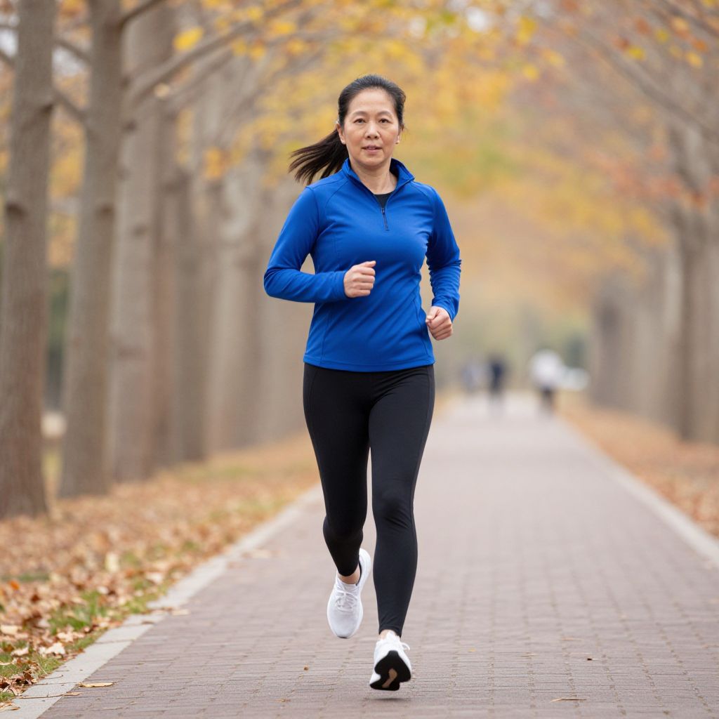 Middle age mature active and healthy Asian woman exercising weight loss body workout jogging running in park path autumn forest. Middle aged lifestyle. Lady in her 50s.