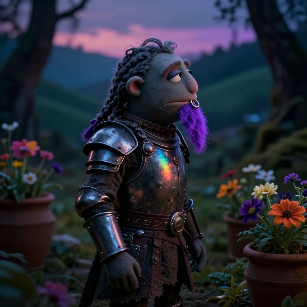 Cinematic photo ethereal fantasy concept art of digital art, Rule of Thirds, profile of a Silky Masterpiece tiny Berber (Uncle:1.3) Muppet, he is surrounded by Pots with flowerss, he is feeling very envious, dressed in a very Gritty medium armor, The steel armor is partially unbuttoned, the Uncle has Braids hairstyle, Wavy hair, he has a Unique Belarusian DayGlo purple Goatee, Puny Ring, lush hillside with Bark, at Twilight, deep focus, (stylized by Anna Dittmann:1.0), Maximalist, Shameless, Classical Realism, Ambient lighting, Low shutter, Charcoal neon hue, cinematic, dripping dark rainbow, matte skin, highly detailed face, Best quality, trending on CGSociety, cyberpunk, Digital artwork featuring Uncle Sam in a gritty medium armor set amidst a lush hillside at twilight under deep focus. He is surrounded by pots filled with vibrant flowers and sports a unique Belarusian dayglo purple goatee. The uncle's braided hairstyle adds to his imposing presence. The charcoal neon hue casts an ambient glow throughout the scene. Highly detailed and rendered in the best quality possible. This piece is likely to be trending on CGSociety and could be considered a cyberpunk masterpiece. . magnificent, celestial, ethereal, painterly, epic, majestic, magical, fantasy art, cover art, dreamy . 35mm photograph, film, bokeh, professional, 4k, highly detailed