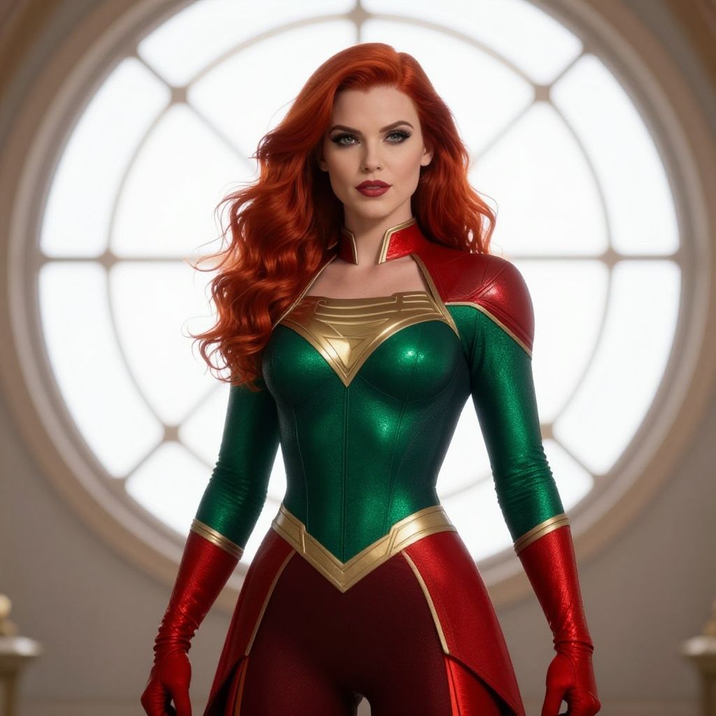Photograph of a strong, confident woman with long brown hair and striking blue eyes. She's wearing a flowing red cape with gold trim, and a revealing red outfit that shows her toned thighs and a gold waistband. She stands against a bright, radiant sunburst in the sky, with fiery orange and yellow light surrounding her. The sky is partly cloudy, adding depth to the dramatic scene. She looks directly at the camera with a fierce expression.