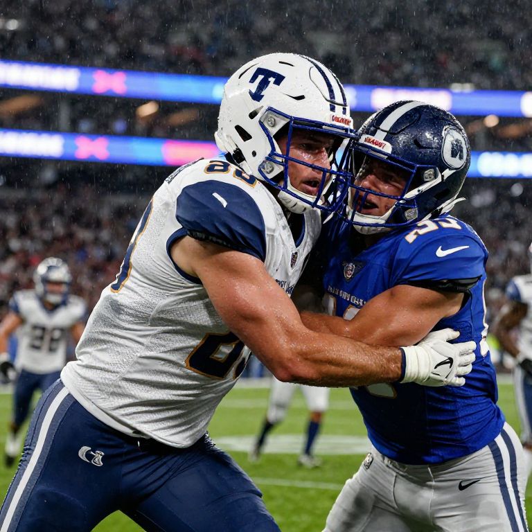 Photograph of an intense NFL game moment. Two male football players, one in a white and navy uniform with the number 9, and the other in a blue and white uniform with the number 24, are locked in a fierce tackle. Both wear white helmets and are visibly muscular. The background shows a rainy night game with blurred spectators and bright stadium lights. The player in blue is slightly shorter, and both are gripping each other tightly. The field is green, and raindrops are visible.