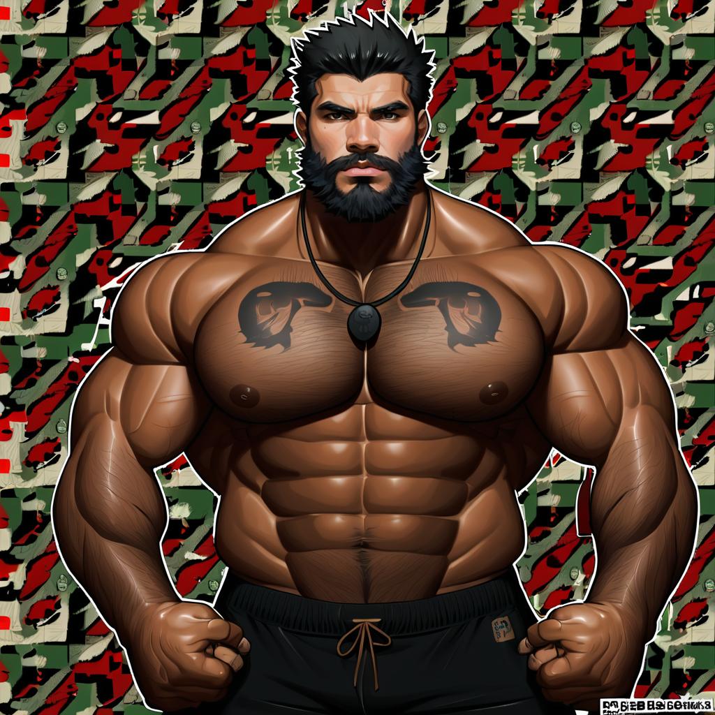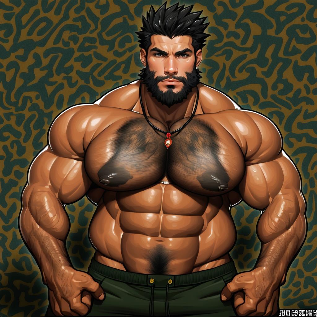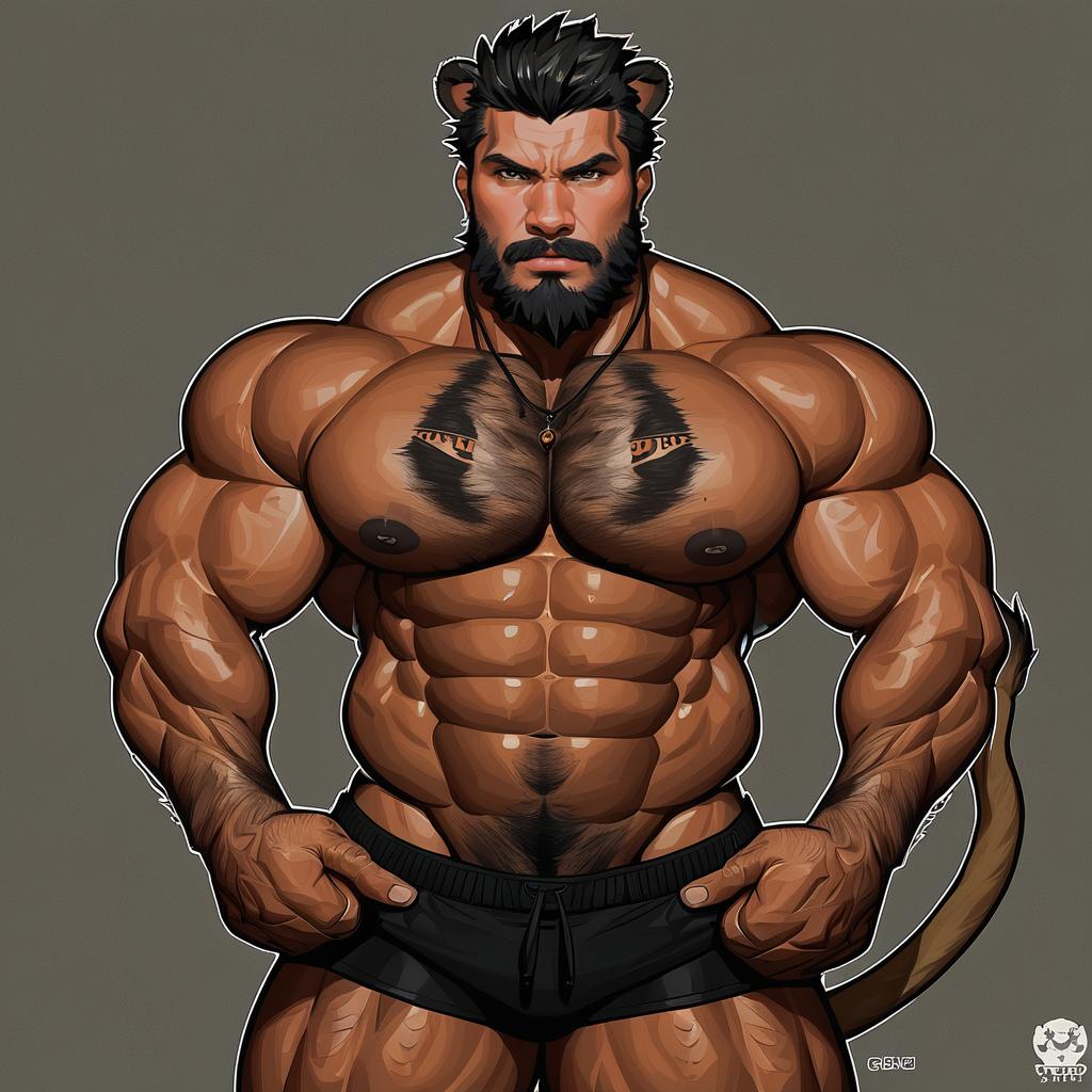 Alca (wakatanka4), gyee, 1boy, lion boy, mature male, lion ears, beard, lion tail, extra ears, red eyes, thick eyebrows, short hair, black hair, navel hair, chest hair, leg hair, chest tattoo, nipples, thick thighs, navel, necklace, bara, muscular male, large pectorals, abs, undercut, sideburns, stomach, by artist houzuki (hotondo), anime