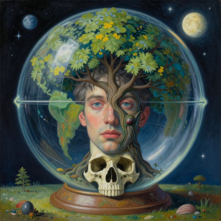 A surreal, intricate painting features a man's face intertwined with a tree, enclosed in a glass skull and globe, with celestial elements and vibrant colors, reminiscent of the works of Naoto Hattori, Alexandr Kumpan, and Zdzislaw Beksinski.