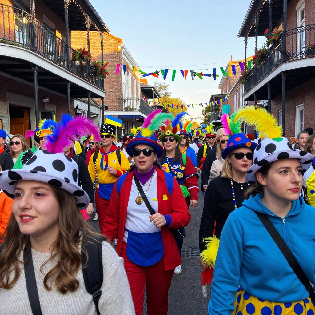 This is a colorful photograph of a lively street parade. A crowd of people, dressed in bright, elaborate costumes with hats adorned with feathers, polka dots, and other festive accessories, fills the narrow street. The background shows brick buildings with balconies, decorated with strings of lights and streamers. The sky is clear, and the energy is vibrant and cheerful.