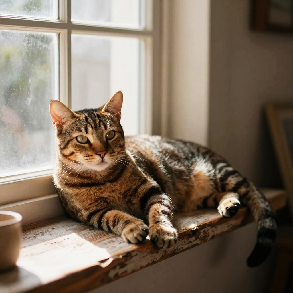 Adult bobcat coffee roaster in cozy roastery filled with burlap sacks and rustic roasting equipment, intricate fur and whisker detail, expressive hazel eyes catching warm highlights, relaxed natural pose, cozy props (books, teacup, instruments, plants), soft dust motes in the air, gentle window shadows, warm golden palette, subtle rim light, soft ambient lighting, inviting lived-in atmosphere, high fidelity texture, balanced composition, warm toned digital illustration with painterly texture