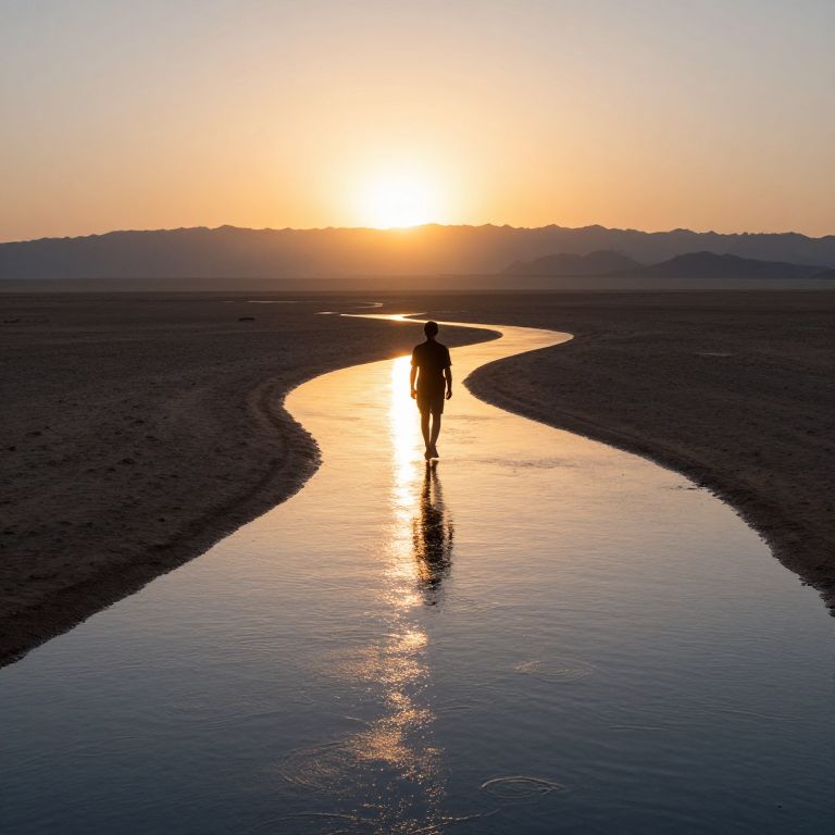Silhouetted figure stands at the threshold of an ornate archway, casting a long shadow as warm golden light illuminates the path ahead, leading through a series of identical arches that recede into the distance.