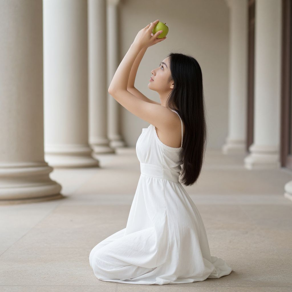 Photograph of an Asian woman with long, straight black hair, kneeling on a light beige stone floor in a classical colonnade. She wears a flowing, sleeveless white dress and holds a green apple above her head with both hands, looking up at it. The background features tall, white marble columns with soft, natural light filtering through, creating a serene and elegant atmosphere. The woman's skin is fair, and her expression is calm and focused. The image has a soft, natural light and a slightly dreamy, ethereal quality.