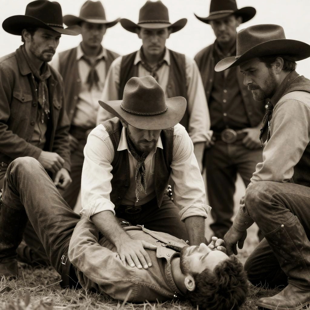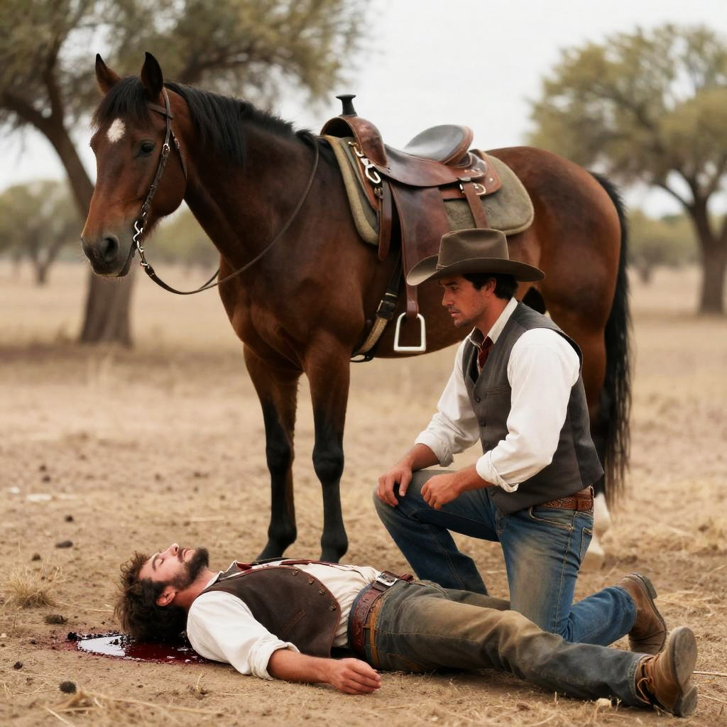 Western movie scene. Man in tan suit and black hat kneels, pointing gun at fallen man on ground. Saloon and general store buildings with wooden facades line street. Horse and rider in background. Rocky hillside in background. Three people total. Intense expressions.