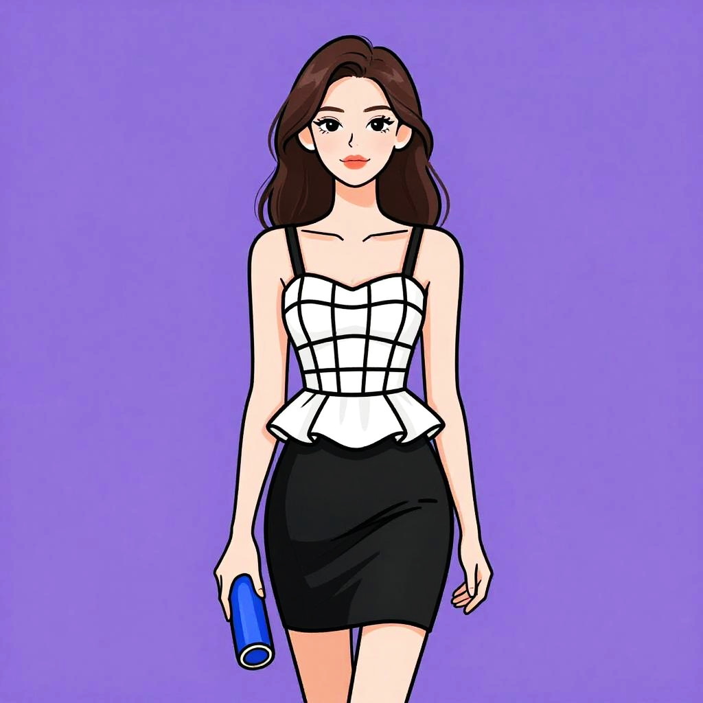 Digital drawing of a fair-skinned woman with long brown hair and red lipstick, standing against a solid purple background. She wears a white, sleeveless, structured top with black straps and a black, high-waisted skirt. Her right hand holds a blue cylindrical object. The art style is cartoonish with bold black outlines and flat colors. She has a confident expression and is centered in the image. The overall aesthetic is modern and chic.