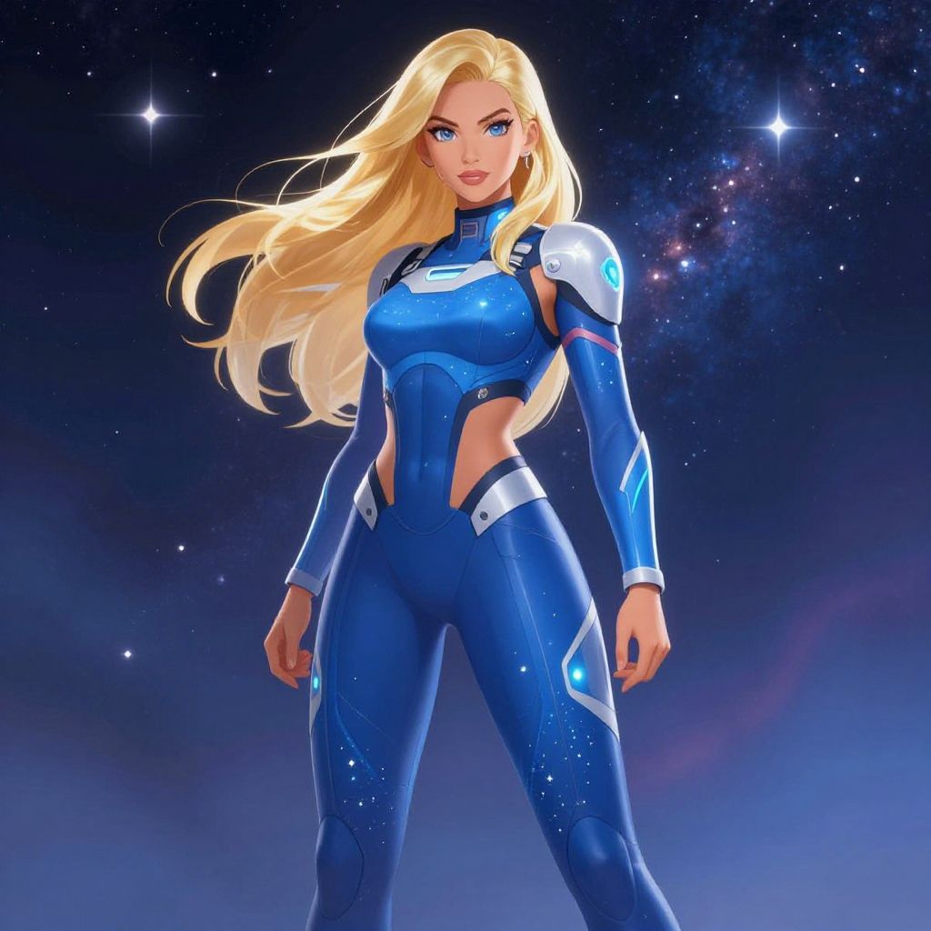 Digital art of a blonde, blue-eyed woman in a blue, form-fitting spaceship suit with silver armor, standing confidently against a starry space background
