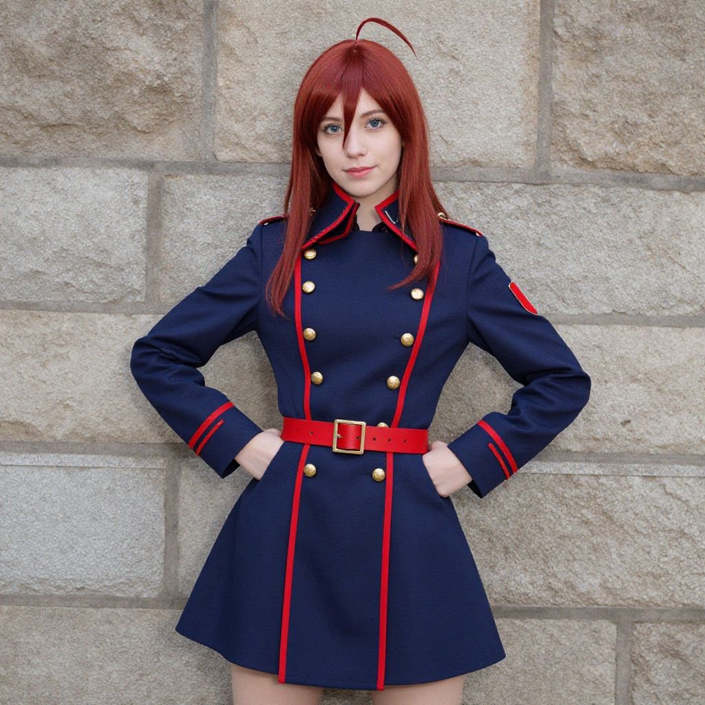 Photograph of a young woman with fair skin and straight, medium-length red hair, standing against a textured stone wall. She wears a navy blue military-style coat with red trim, gold buttons, and a red belt. Her hands rest confidently on her hips. The coat has red stripes on the cuffs and collar, and a red patch on the right shoulder. She has blue eyes and a slight smile, with a small hair strand playfully standing up from her head. The image has a crisp, vibrant quality with clear, sharp details.