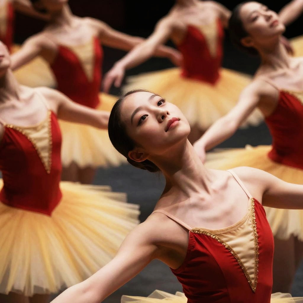 A ballet corp, in a theater, wearing red ballet dress with yellow tutu, good hand, 4k, high-res, masterpiece, best quality, head:1.3, ((Hasselblad photography)), finely detailed skin, sharp focus, (cinematic lighting), soft lighting, dynamic angle, [:(detailed face:1.2):0.2], medium breasts