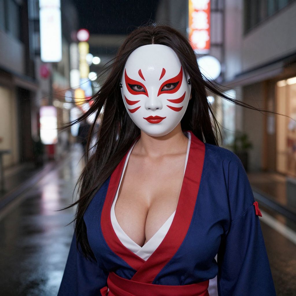 Photograph of a woman with long, dark brown hair wearing a white mask with red tribal-like markings around her eyes. She has fair skin and is dressed in a deep blue kimono with a red trim and white undergarment revealing ample cleavage. The kimono is tied with a red obi belt. She stands in a nighttime urban street, illuminated by neon signs and blurred lights, creating a wet, reflective surface on the ground. The background includes buildings and storefronts, adding an Asian city atmosphere to the scene. The mask's design contrasts sharply with her vibrant red lipstick.