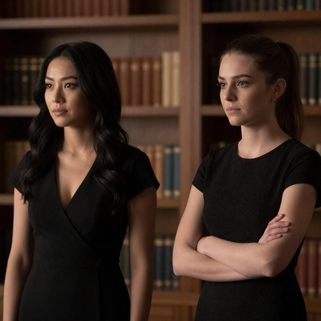 Photograph of two women in black tactical uniforms with long sleeves and gloves. The woman in the foreground has long, straight black hair, dark skin, and a serious expression. The woman in the background has wavy brown hair and a slightly turned head. They are seated in a dimly lit, modern room with white walls.