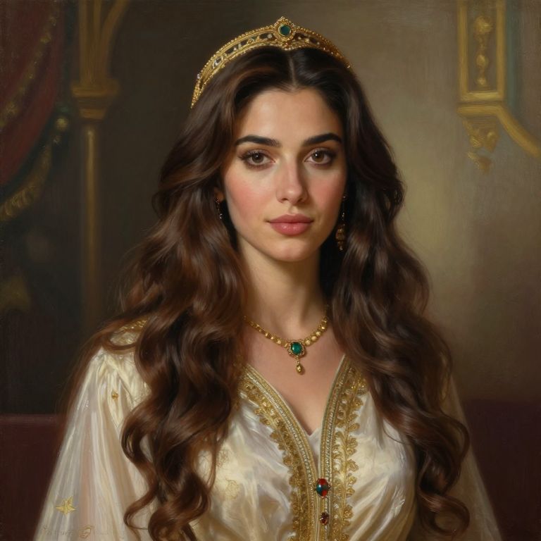 This digital painting depicts a young woman with long, wavy brown hair and fair skin, wearing a golden tiara adorned with a green gem. She has large, dark brown eyes and full lips. She is dressed in an elegant, cream-colored robe with intricate gold embroidery and a matching gold necklace with a green gem. Her robe has a deep V-neck, revealing a hint of her collarbone. The background is a softly lit, ornate room with dark brown and gold tones, featuring decorative pillars and drapery. The overall style is reminiscent of classical portraiture with a modern, digital twist.