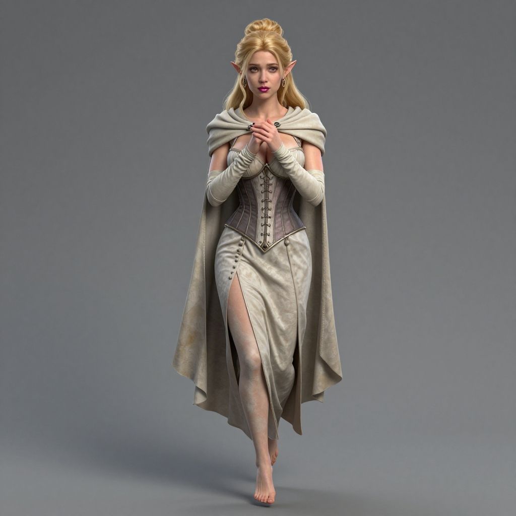 Digital CGI image of a blonde, elf-like woman with pointed ears, wearing a grey corset and cape, barefoot, clasping hands, standing