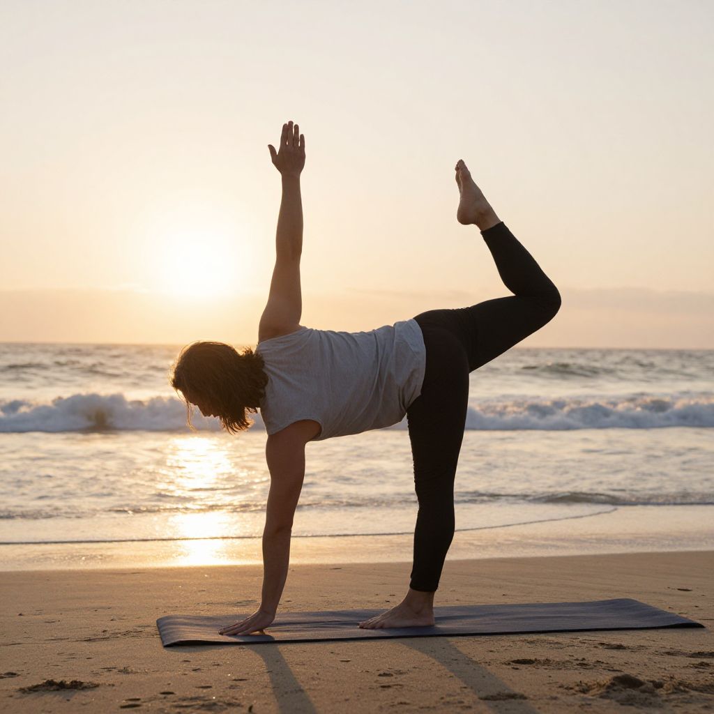 Photograph of a woman in a white shirt and black pants performing a yoga pose on a beach at sunset, with waves in the background and a yoga