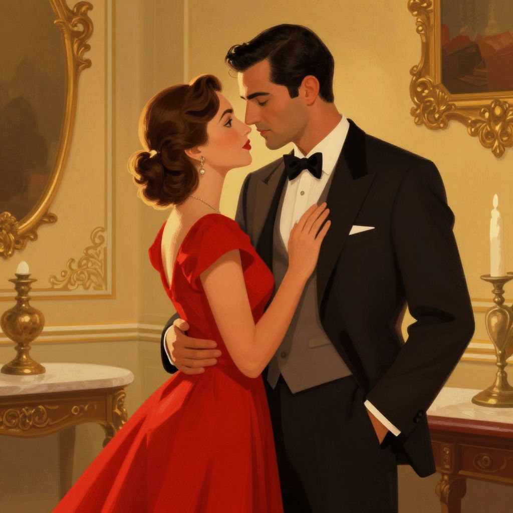 A romantic digital illustration captures a tender moment between a couple in an elegantly lit room, featuring dramatic lighting and a vintage ambiance reminiscent of Fabian Perez's style, with the woman in a vibrant red dress and the man in a formal suit, set against a backdrop of warm golden hues and refined decor.