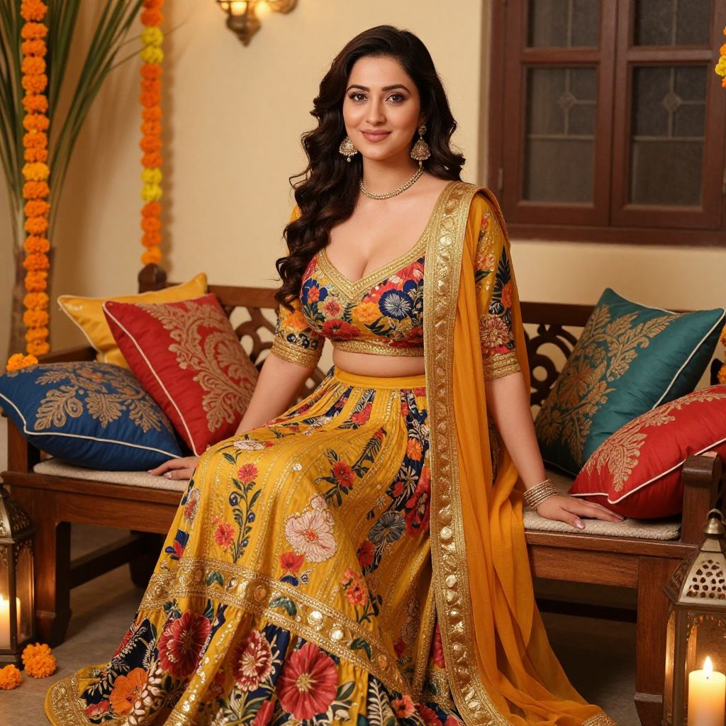 A confident, smiling woman with dark wavy hair and a gentle smile wearing a stylish haldi party dress featuring a bold gold border and floral motifs, sitting on a wooden bench at a wedding reception in a traditional Indian home, decorated with marigolds and colorful cushions, the dress catching the candlelight from a nearby lantern.. The woman has big breasts and cute face