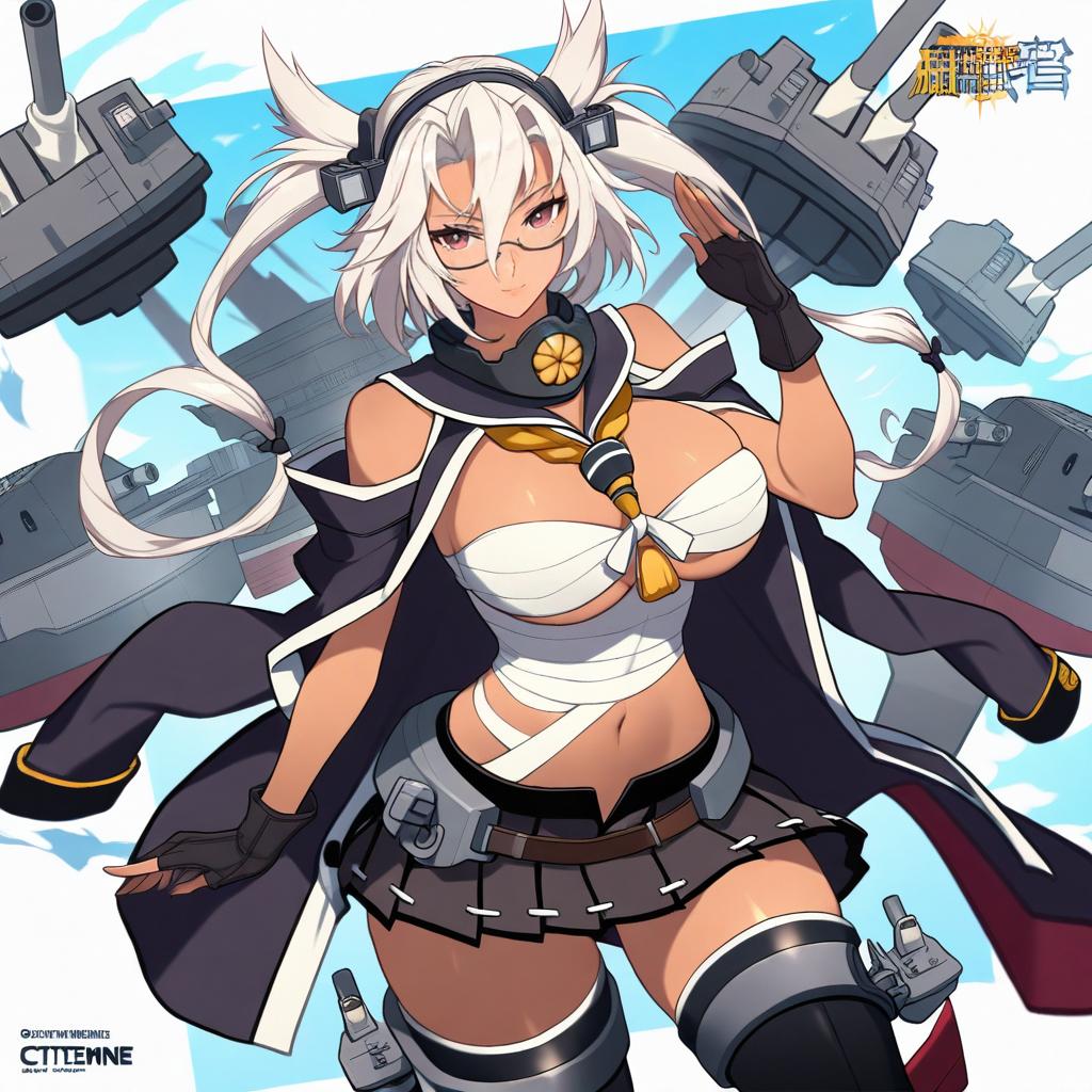 Musashi kai (kancolle), kantai collection, 1girl, dark-skinned female, red eyes, hair between eyes, glasses, pointy hair, long hair, blonde hair, white hair, two side up, twintails, large breasts, chest sarashi, navel, black gloves, fingerless gloves, black thighhighs, black skirt, pleated skirt, budget sarashi, headgear, miniskirt, by artist citemer, animagine