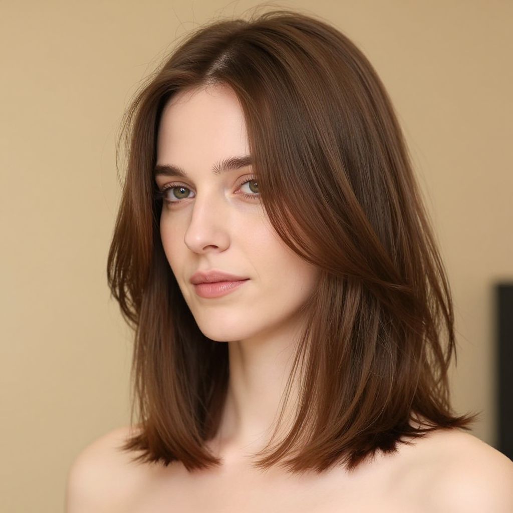 Caucasian woman with Semi-Long Layered Crop hairstyle, soft natural lighting, balanced between long and short layers, styled for versatility and easy maintenance, natural skin tone, warm background, realistic portrait, high detail, subtle elegance, modern fashion setting.