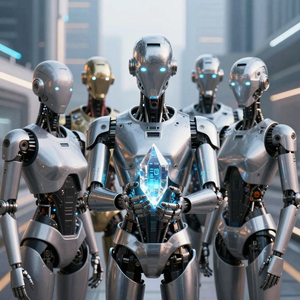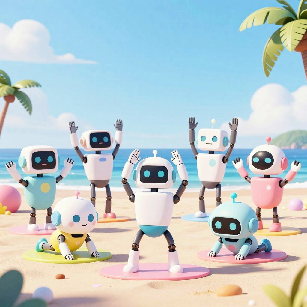 Beach AI concept art showing a futuristic seaside with AI-powered robots assisting beachgoers, bright sunny day, crystal clear water, palm trees swaying, vibrant colors, high detail, sci-fi elements blending with natural beach environment.