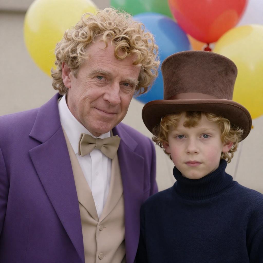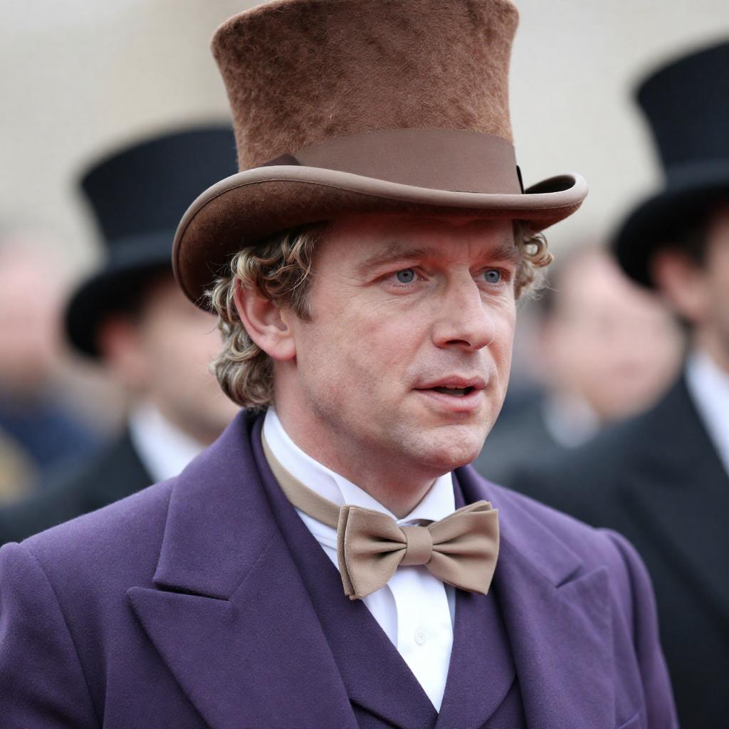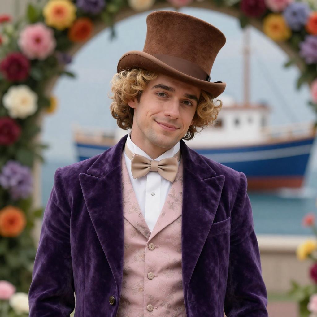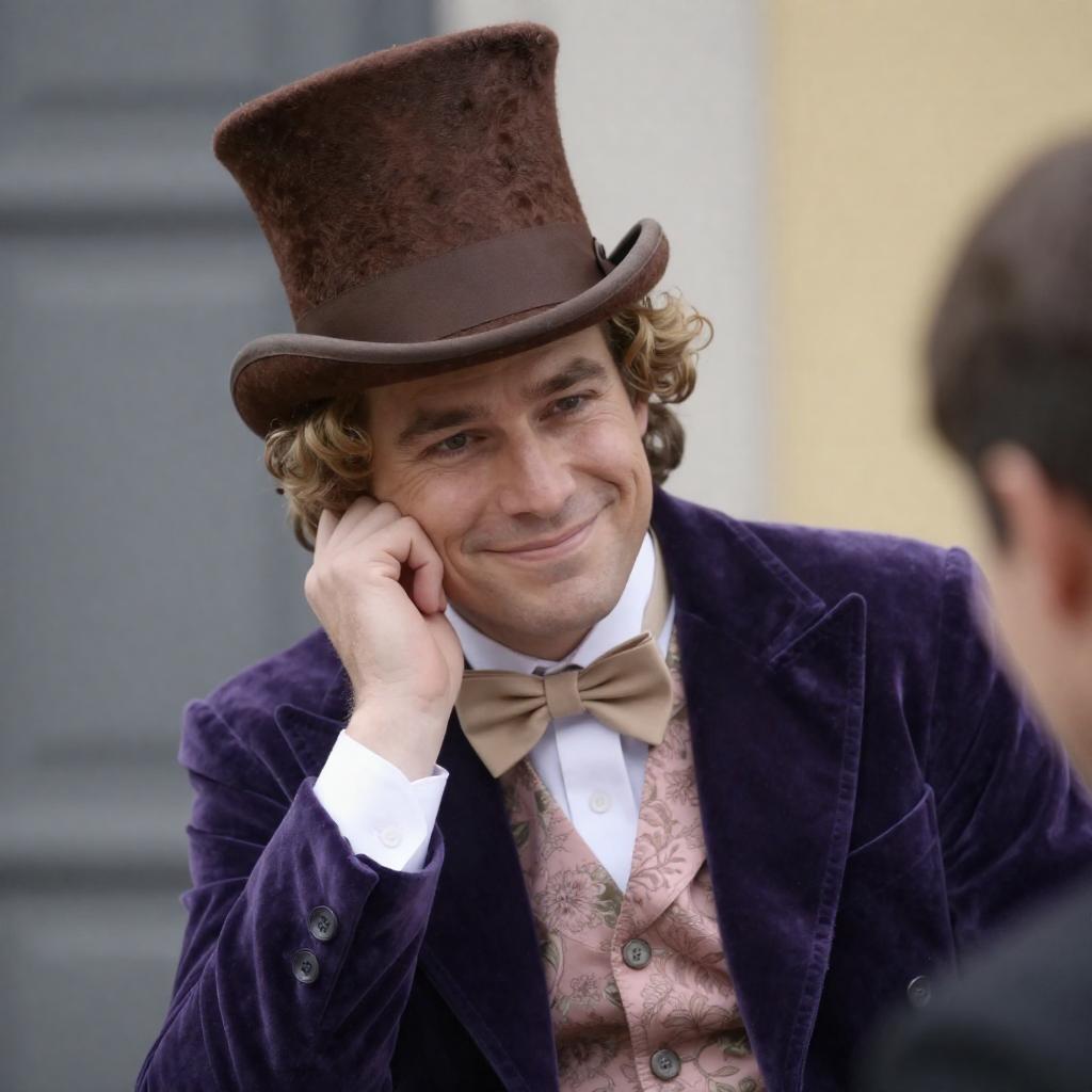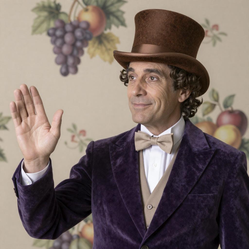 Middle-aged man with curly brown hair, wearing a brown top hat, purple velvet suit, beige bow tie, and white shirt. Floral-patterned background with grapes and fruit. Man's right hand raised, palm up, in mid-gesture. Soft smile on face. Indoor setting.