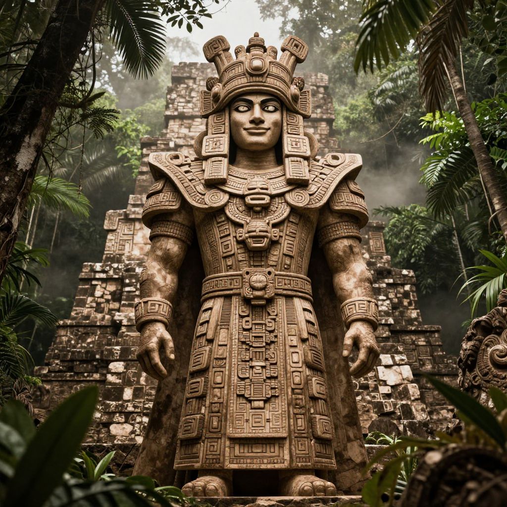 Majestic, mysterious figure, intricately adorned in Mayan artistry, rich sepia tones, standing tall amidst ancient ruins, lush jungle foliage, vibrant greenery, misty morning light, dramatic shadows, atmospheric perspective, captivating gaze, enigmatic smile, regal presence, cultural heritage, historical significance. Man has masculine face and piercing eyes