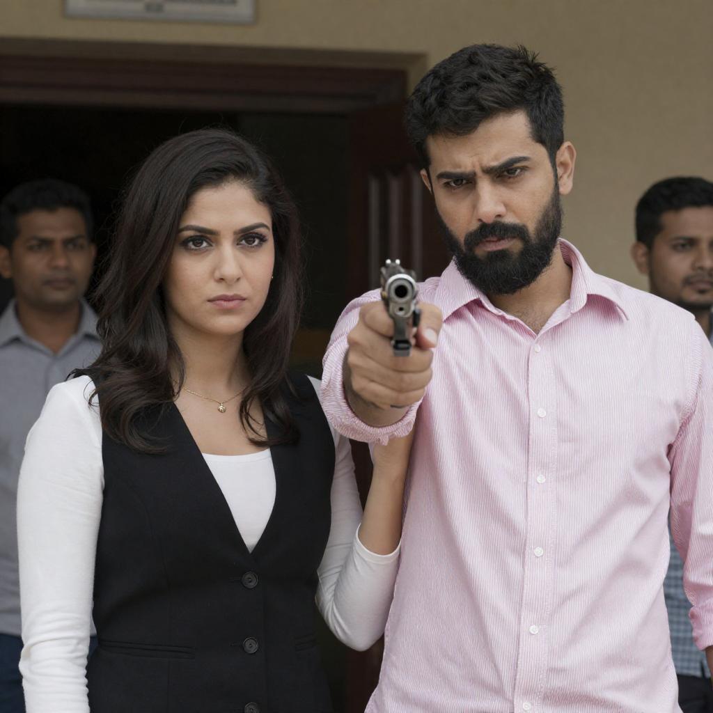A bearded muscular man in a dark brown t-shirt squats holding a bronze bowl emitting smoke while a woman with long dark hair, wearing a brown vest over a long-sleeve grey shirt, pours liquid into the bowl from a small cup. The setting appears industrial with blurred metal structures and pipes in the smoky background. Both individuals are focused on the smoking bowl.