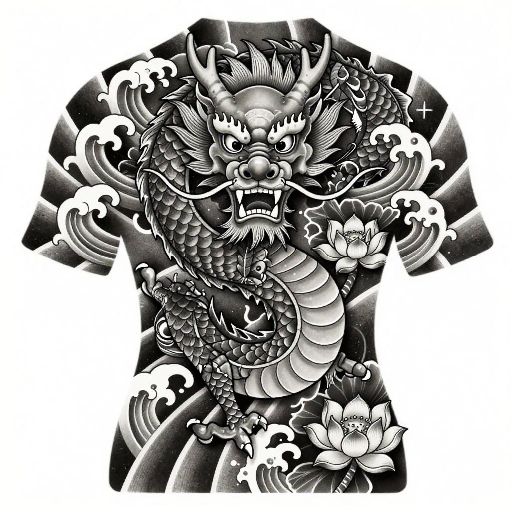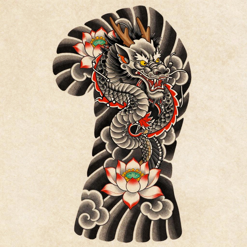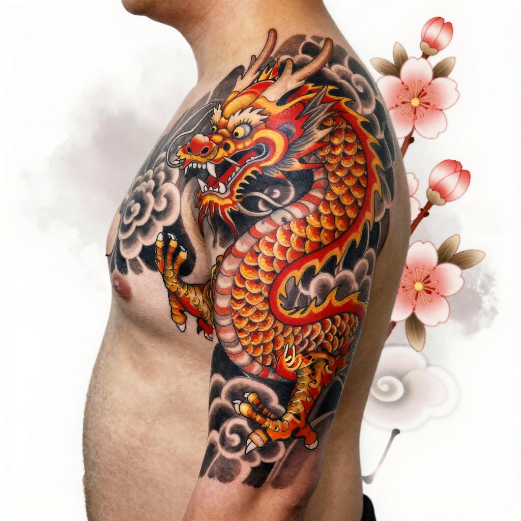 Chinese dragon tattoo, vibrant scales curling around the arm, traditional ink style with fiery red and gold highlights, swirling clouds and cherry blossoms in the background