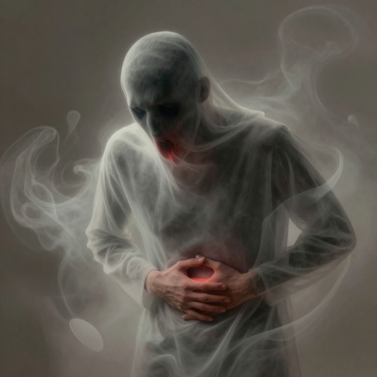 A conceptual digital artwork of retches, featuring a ghostly figure clutching their stomach, surrounded by swirling mists and abstract shapes representing illness, muted earthy tones with sharp highlights, evokes a sense of unease and physical struggle.