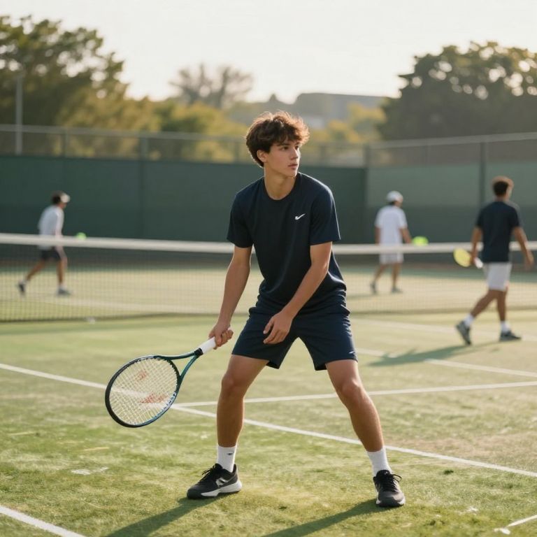 A dynamic scene of a racquet sport match during a rainy afternoon in a suburban neighborhood, one player in a navy-blue athletic jacket and a slightly wet, determined face aggressively returning a serve, raindrops visible on the court surface and nearby pavilion roof.