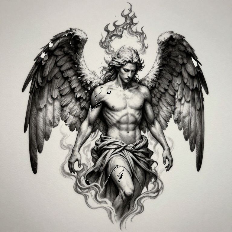 Fallen angel Lucifer tattoo concept art featuring a brooding figure with majestic but damaged wings, somber expression, fiery halo partially broken, dark ethereal smoke swirling around, fine line details, fantasy tattoo art
