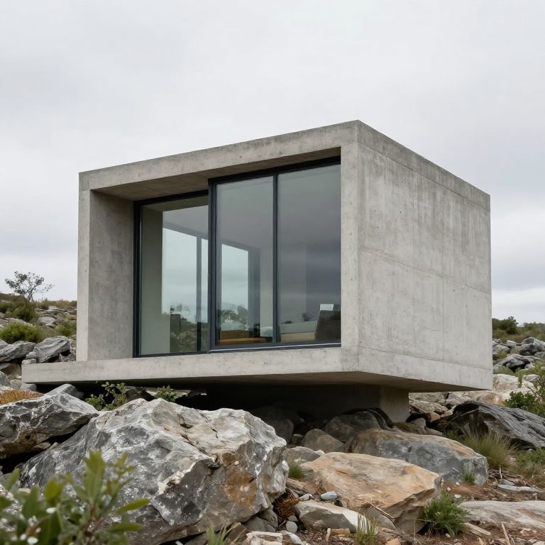 Photograph of a modern, minimalist concrete house with a rectangular shape, elevated on a rocky terrain. The house features large, floor-to-ceiling black-framed glass windows on the front side, reflecting a cloudy sky. The concrete exterior has a smooth, matte texture with visible seams. The rocks around the house are large, gray, and scattered, with sparse green vegetation. The house sits slightly off-center, with the left side of the structure more visible. The overall style is contemporary and geometric, blending seamlessly with the natural rocky landscape.