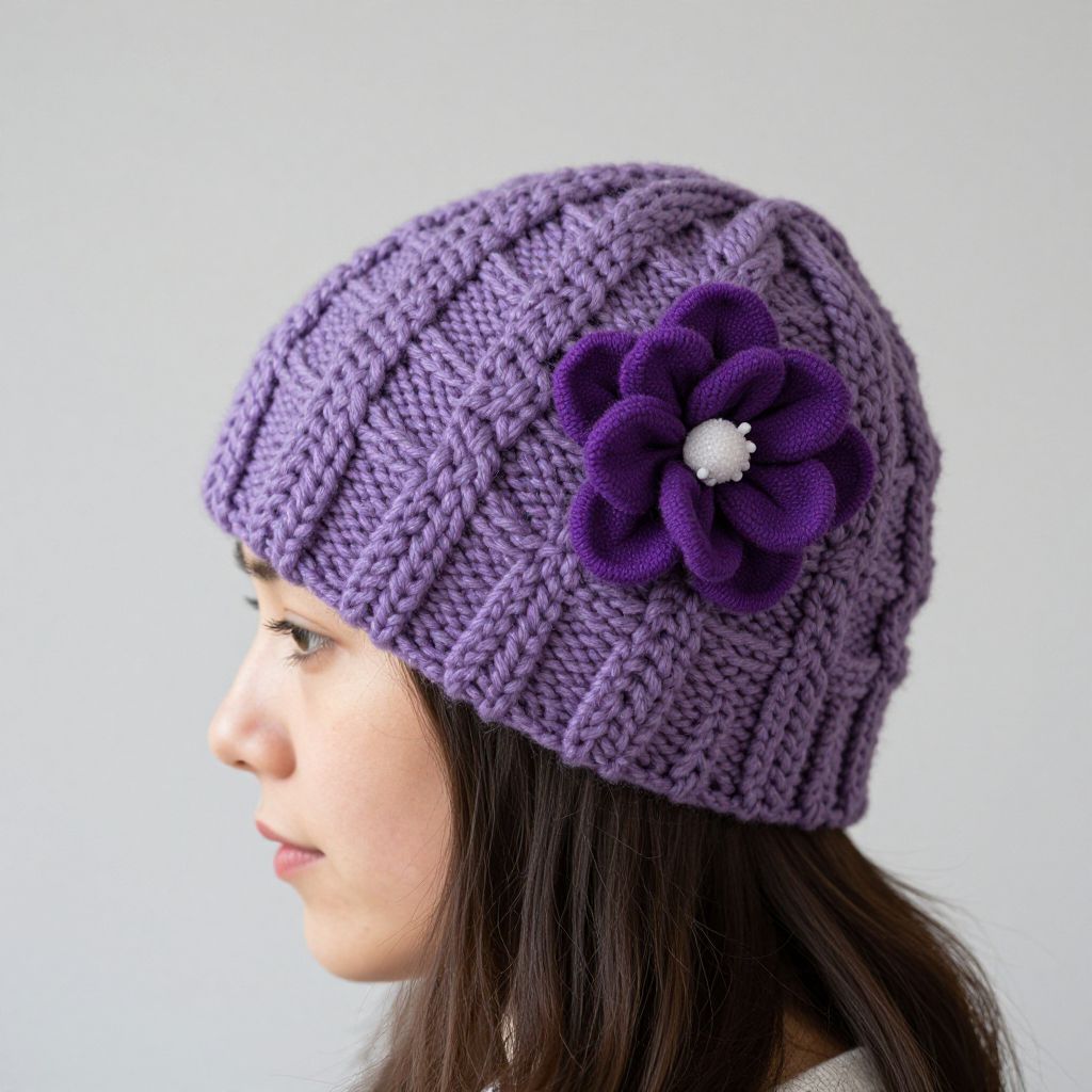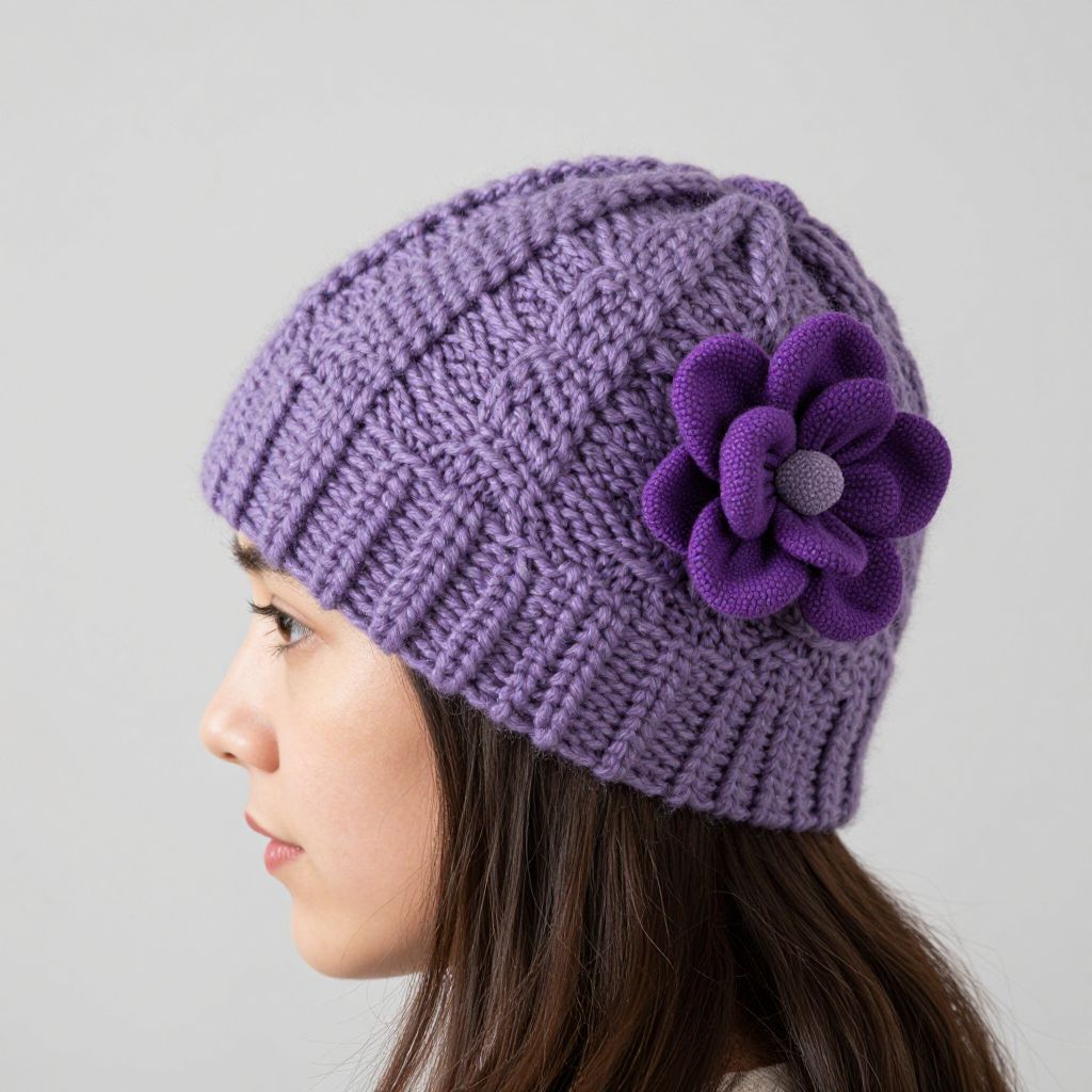 Woman wearing a hand-knit hat featuring a textured cable pattern and a vibrant purple flower embellishment, showcasing intricate craftsmanship against a neutral background.