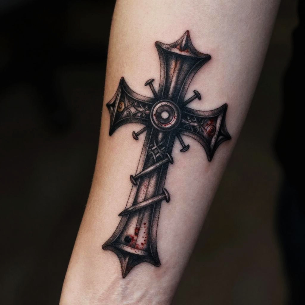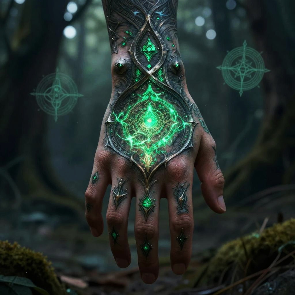 Alchemical tattoos glowing with intricate symbols and ancient runes, inked on the forearms of a mysterious figure, surrounded by swirling mist and arcane light, detailed linework blending science and mysticism in a dark fantasy style.