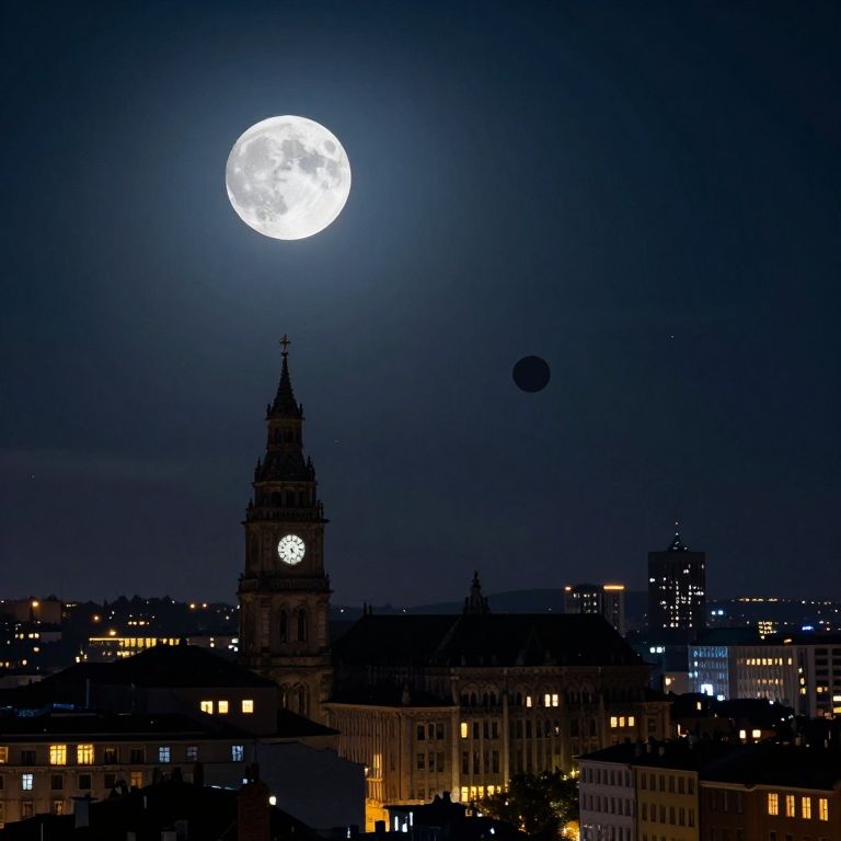 Photograph of a nighttime cityscape featuring a large, bright full moon in the dark blue sky above a Gothic-style clock tower with a glowing clock face. To the right of the moon, a smaller, darker object resembling a shadowy sphere hovers. The city below is illuminated by yellow and white lights, with several buildings visible, including a modern high-rise on the far right. The clock tower is centered in the lower half of the image, contrasting against the moonlit sky.