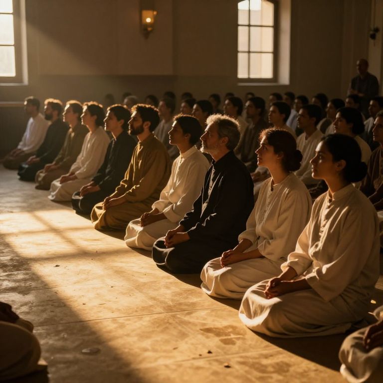 In a chamber bathed in golden light, a congregation of figures sits in quiet reverence, their shadows stretching like whispers of contemplation, as the sun's embrace casts a timeless dialogue between presence and absence.