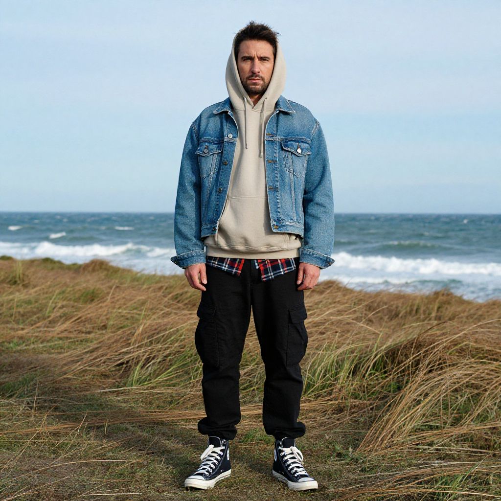 A man, cropped denim jacket, loose-fitting beige hoodie, black cargo pants, high-top canvas sneakers, plaid shirt peeking out, coastal wind-swept field, technicolor analog film stock, relaxed expression, waves crashing nearby. Man has masculine face and piercing eyes