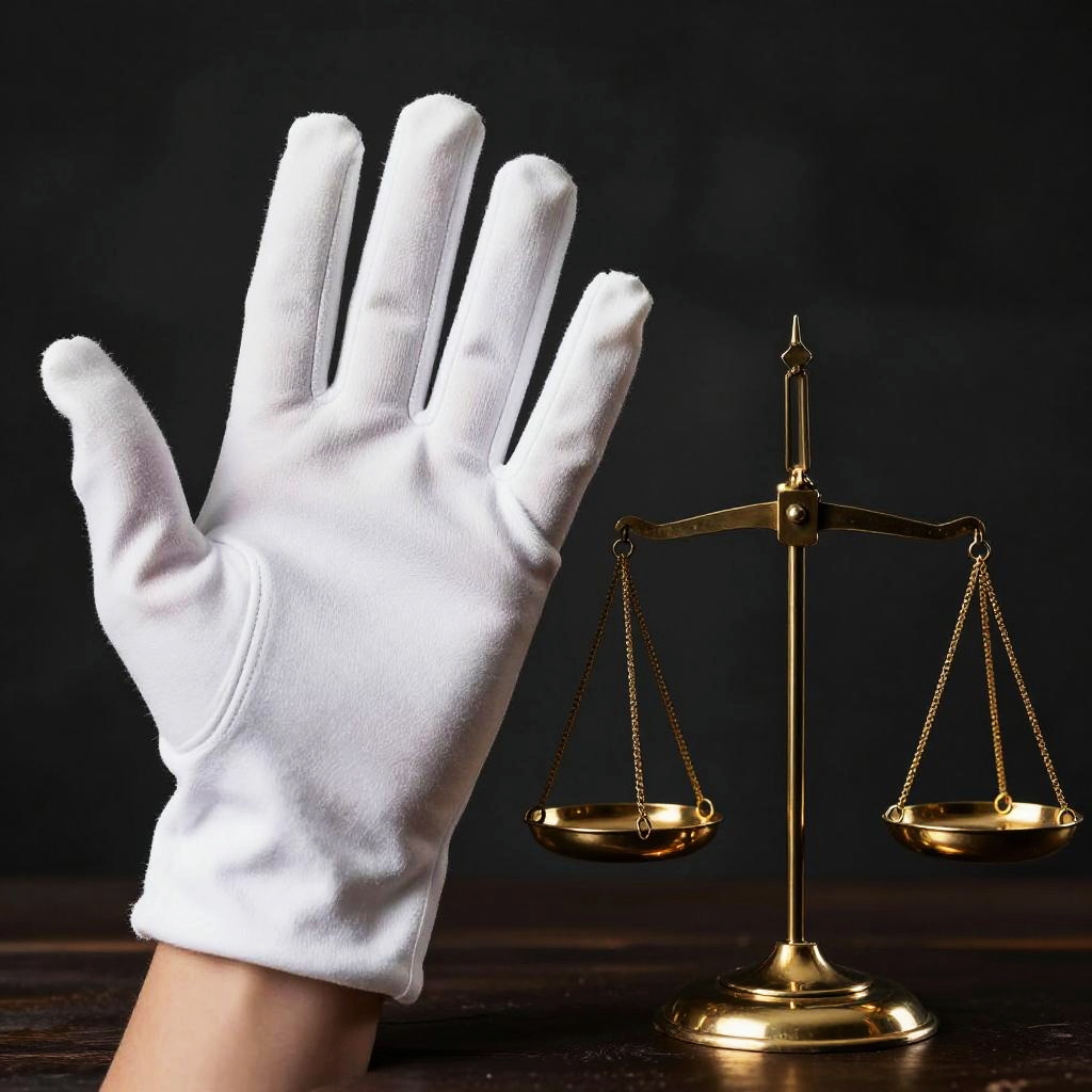 White glove symbolism illustrated through a white glove paired with golden scales of justice on a dark dramatic background, highlighting themes of fairness and integrity, cinematic lighting, high detail, hyper-realistic textures, intense and striking visual impact.