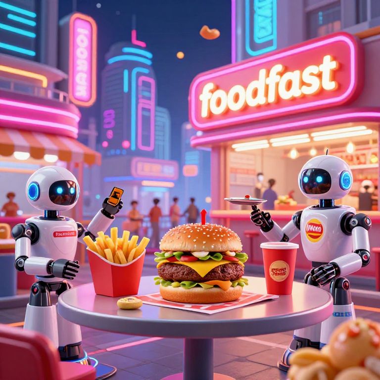 Foodfast.online themed futuristic fast food restaurant with neon signs and sleek robots serving gourmet burgers and fries, vibrant colors, dynamic urban background, digital art style, high detail, bustling city vibe, night setting