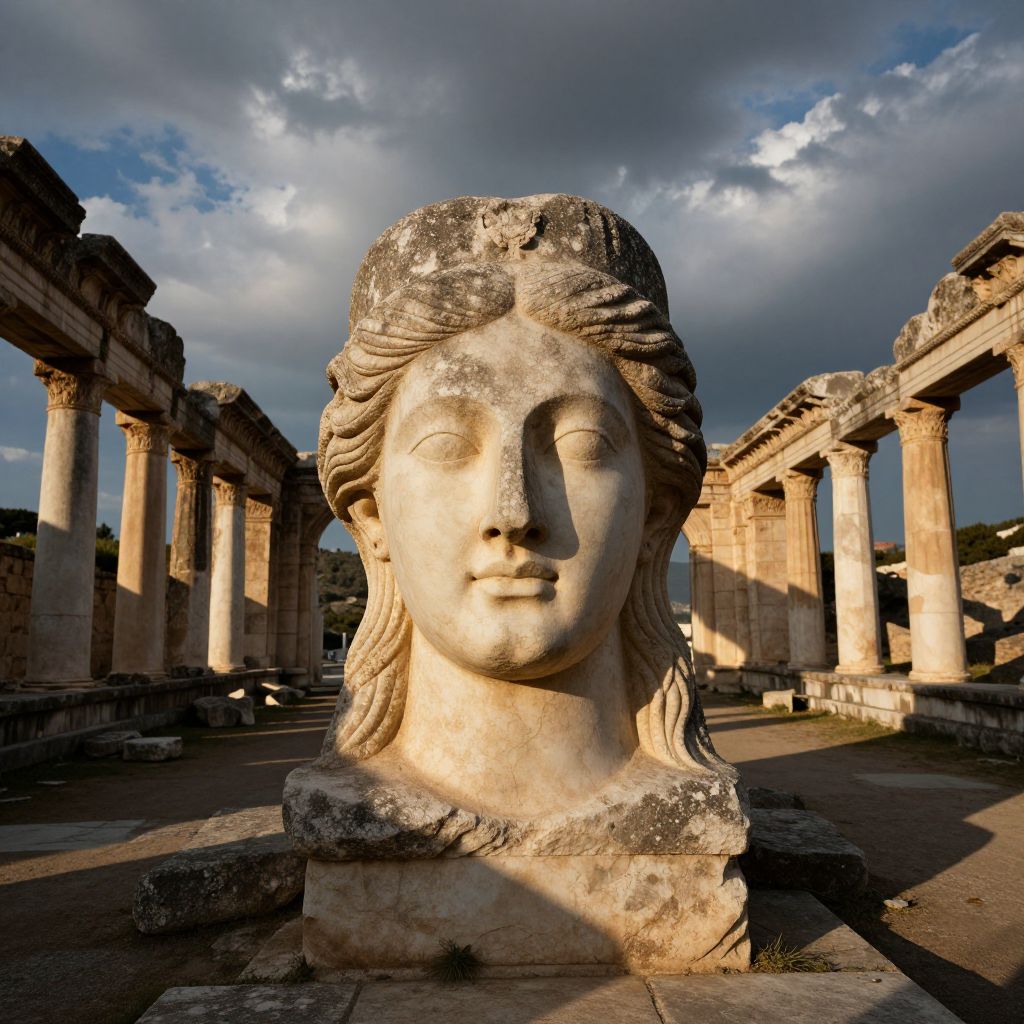 Photograph of a weathered, classical-style stone bust of a woman with long, wavy hair, set in the foreground of an ancient Greek-style ruins courtyard. The bust, with smooth, rounded features and simple, serene expression, is positioned slightly to the left. Tall, worn, marble columns frame the background, bathed in sunlight with shadows cast on the ground. The sky above is dramatic, with dark, cloud-filled patches contrasting with bright blue and sunlight. The stone textures of the bust and columns exhibit signs of age and erosion. The image captures a sense of historical grandeur and timelessness.
