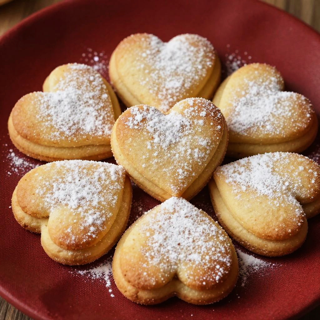 This close-up photo shows a pile of heart-shaped sugar cookies dusted with powdered sugar. The cookies are golden brown with a slightly rough texture. They're arranged on a deep red, slightly crumpled fabric, which adds a cozy feel to the image. The red fabric contrasts with the cookies' warm color, making the sugar dust sparkle. The photo is bright and vibrant, highlighting the cookies' delicious appearance.