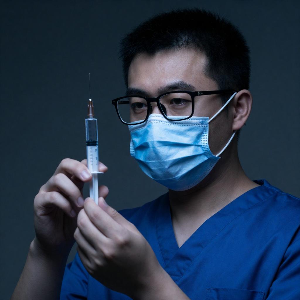 Photograph of a middle-aged man with short, gray hair, wearing glasses and a white lab coat over a green shirt, standing in a sterile medical room. He holds a syringe in his right hand, looking down at it. Background includes a wall-mounted scale, a sink, and cabinets. Window with a blind is above the sink. Man's expression is focused. Clinical, white-walled setting. One person, standing, examining syringe.