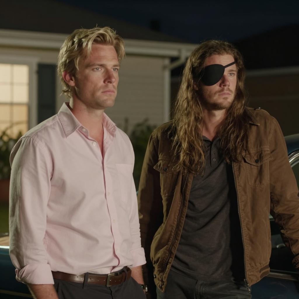 Photograph of two men in a car at night. A deer's head is visible through the windshield between them. The man on the left has red hair, a green jacket, and a neutral expression. The man on the right has blonde hair, a red jacket, and a serious expression. The car's dashboard and rearview mirror are in the foreground.
