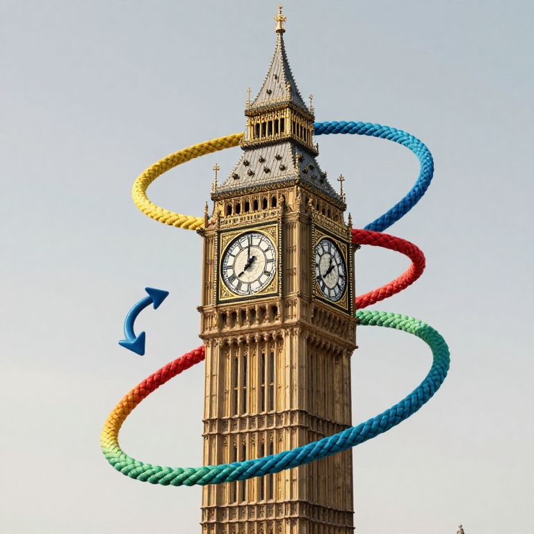 Photograph of Big Ben clock tower with a colorful twist. The iconic, beige, Gothic-style clock tower, featuring two white clock faces with black Roman numerals, is surrounded by four vibrant, rainbow-colored ropes spiraling around it. The ropes are blue, green, yellow, and red, each forming a loop around the tower. A blue arrow points to the left, while a red arrow points to the right, adding a dynamic, motion-like effect. The background is a clear, bright blue sky, emphasizing the tower's detailed architectural features and the striking colors of the ropes.